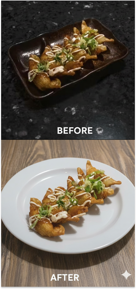 We instructed the AI to "dramatically increase natural light and enhance the saturation of the garnish," turning a bland photo into a vibrant, high-converting visual.